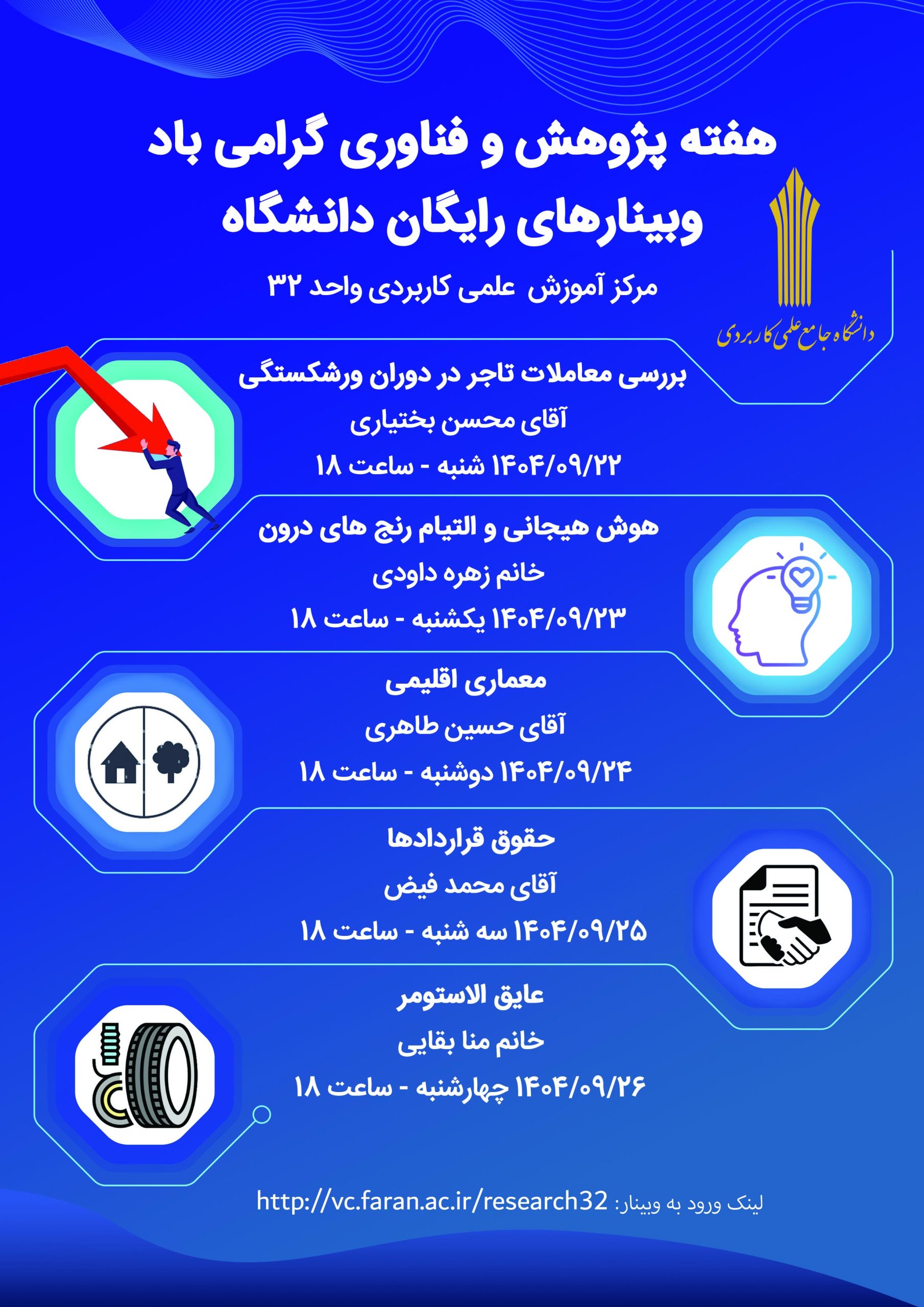 به اطلاع دانشجویان گرامی و علاقمندان می رساند این مرکز به مناسبت گرامیداشت هفته پژوهش سلسله وبینارهای رایگان از روز شنبه مورخ 1404/09/22 لغایت چهارشنبه مورخ 1404/09/26 ساعت 18 برگزار می کند. حضور در وبینار برای عموم علاقمندان آزاد است.